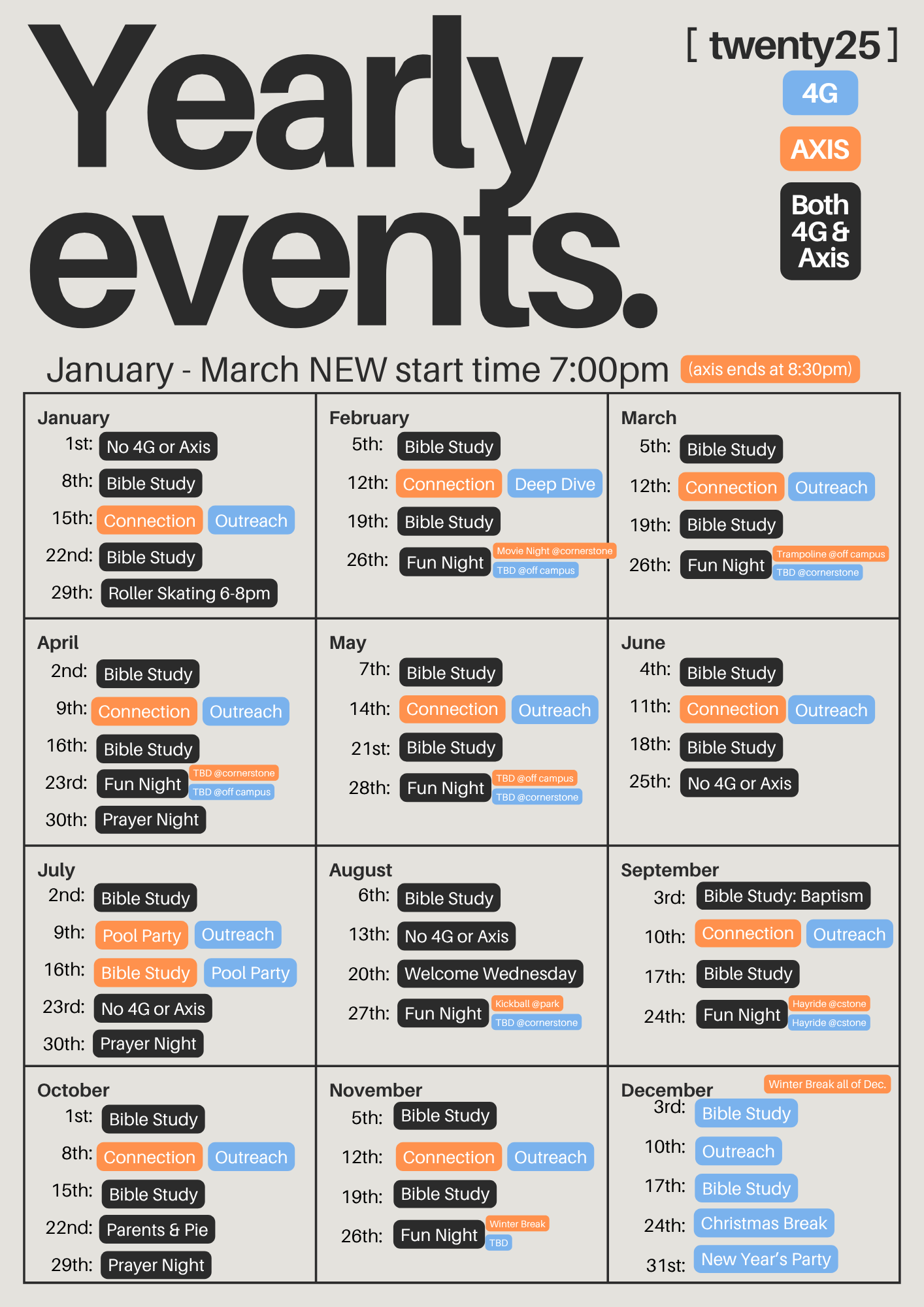 Axis will do worship and teaching with 4G on Wednesday nights at 7:30pm at Cornerstone. The worship & teaching portion of the evening will be the only mix of the high school and middle school. After the teaching we will split into small groups and grab a snack. From there we will play games and hang out.
